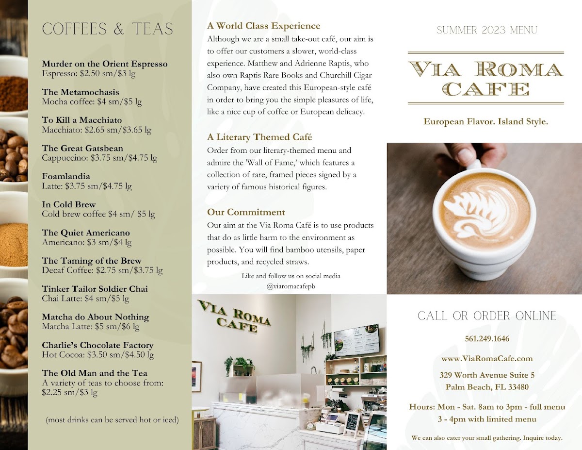 In all, Via Roma Café presents the perfect blend of delightful eats, enchanting environment, and spirited service. Stop by for a nourishing sandwich or a revitalizing latte and let it captivate your senses. Whether you're starting your day or taking a break in between shopping sprees, this little café is an enchanting treat waiting for you in the heart of Palm Beach.